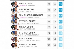 本赛季,约基奇每回合单打得1.27分,超平均水平0.33分皆是近20个赛季最高。