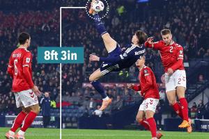 据太阳报统计,麦克托米奈倒钩时脚部高度达到了8英尺3英寸(约2.53米),比C罗在皇马时对阵尤文的倒钩高度(7英尺7英寸,约2.38米)还要高。