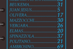 那不勒斯首发:32-瓦尼亚·米林科维奇;31-别克马、5-胡安·热苏斯、17-奥利维拉;30-马佐基、26-维尔加拉、20-埃尔马斯、37-斯皮纳佐拉;21-波利塔诺、69-安布罗西诺、27-卢卡