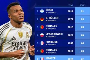 体育资讯12月08日讯姆巴佩今年进球已达62球,进入历史前十,德转盘点了足坛历史自然年进球纪录。
