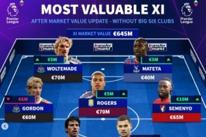 体育资讯12月10日讯 德转于12月9日更新了英超球员身价,列出了无Big6球员的身价最贵阵,托纳利、格伊、摩根·罗杰斯在列,总身价6.45亿欧。