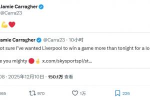 体育资讯12月10日讯 利物浦1-0客胜国米,卡拉格转发了赛前谈萨拉赫的推文,并配文:拿下!