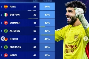 体育资讯12月11日讯 德转盘点了近10年欧冠门将零封场次占比排行榜(至少25次出场),其中拉亚54%的比赛能够零封居首,具体如下(比赛场次+零封比例):