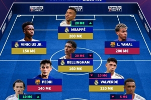 前锋:维尼修斯(1.5亿欧)、姆巴佩(2亿欧)、亚马尔(2亿欧)