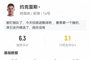 体育资讯12月14日讯 本轮英超,阿森纳主场暂1-0狼队。此役约克雷斯首发81分钟被换下,球员全场重点数据如下↓