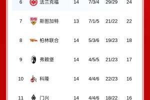体育资讯12月15日讯 德甲第14轮基本结束,拜仁1-1美因茨9分领跑,此前第2的莱比锡本轮1-3不敌柏林联合,第3的多特1-1憾平弗赖堡,最新积分榜如下: