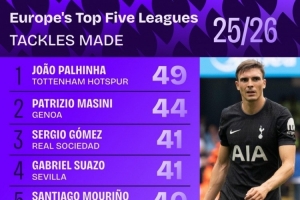 本赛季五大联赛成功抢断榜:帕利尼亚49次居首,马西尼44次第二