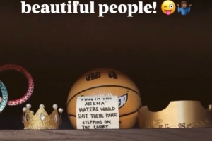 詹姆斯晒出了他在自家衣柜里摆放的一张激励自己的手写字条:“‘竞技场中的人’黑子们一踏上球场就会吓得屁滚尿流。”
