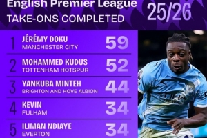本赛季英超成功过人榜: