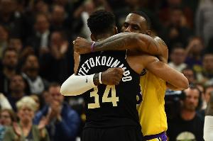 据湖人记者Mark Medina报道,赛后詹姆斯送给字母哥一件湖人23号签名球衣,字母哥兴奋向队友炫耀,甚至直接穿上了。