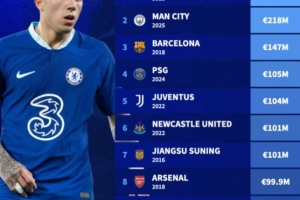 以下为足坛俱乐部单个冬窗引援花费排行榜: