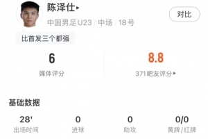 体育资讯1月25日讯 U23亚洲杯决赛,U23国足0-4不敌日本U23,夺得赛事亚军。替补出战的陈泽仕数据如下: