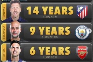五大联赛现任主帅执教时长榜:西蒙尼、瓜迪奥拉、阿尔特塔在列