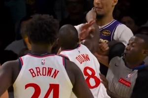 东契奇抢板被推 海斯帮东契奇出头从背后推搡邓恩 双方爆发冲突